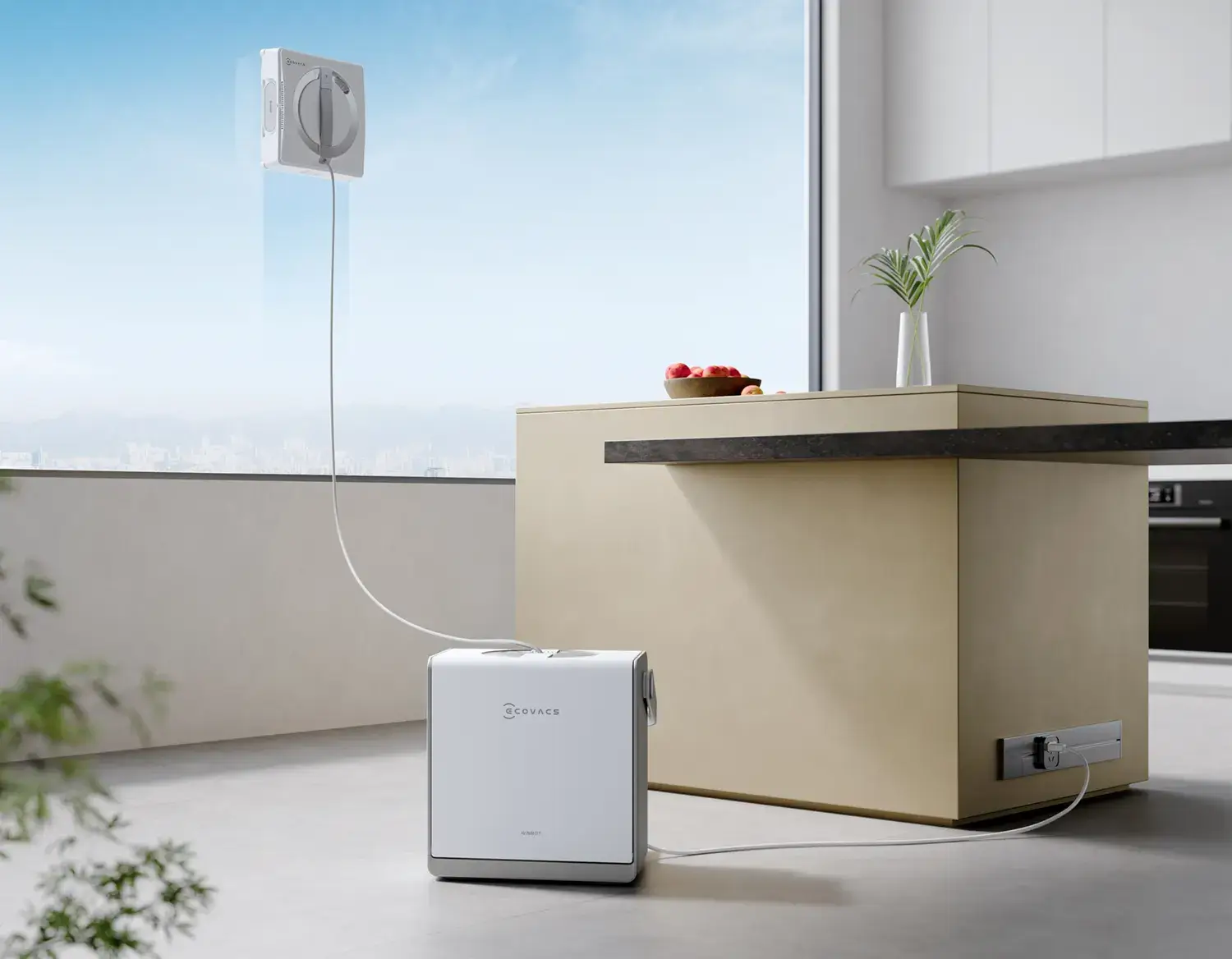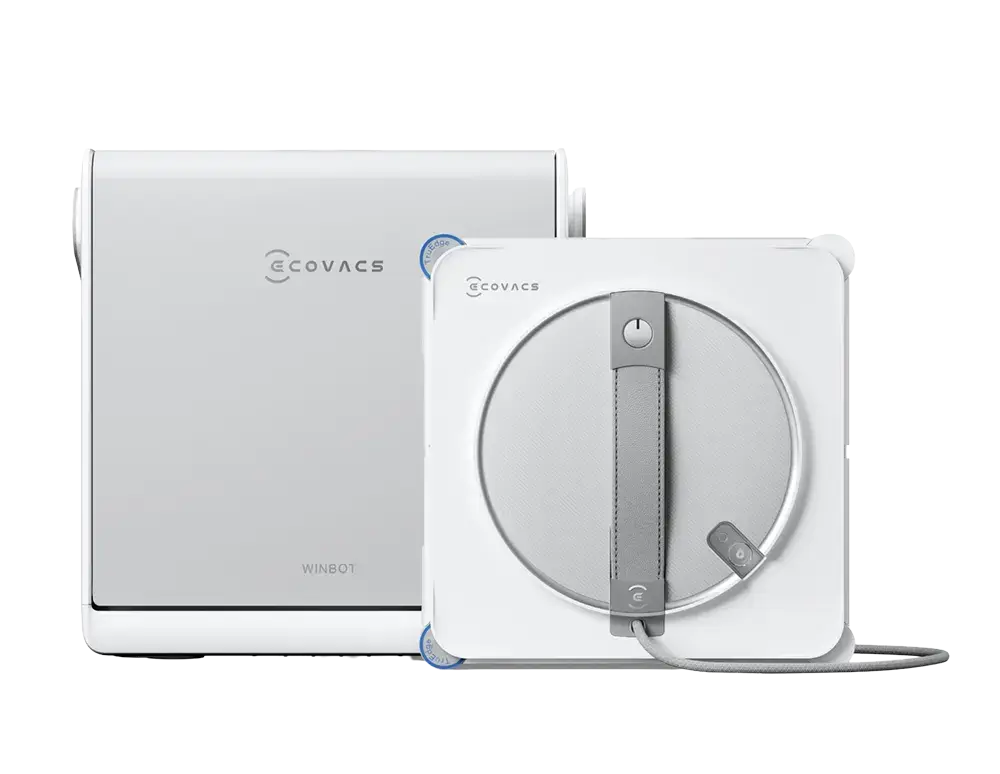 Die Wischer von Ecovacs sind nicht nur auf Teppichen und Hartböden zu Hause. Die Winbot-Serie kümmert sich seit 2011 um große Fensterfronten und schwer erreichbare Glasflächen – vom Wintergarten bis zur Glasbrüstung. Der Winbot W2S Omni ist das jüngste Modell dieser Reihe und arbeitet mit einer stationären Basis, die Strom, Reinigungsmittel und Sicherheitsleine vereint. Ein Kabel verbindet beide Geräte. Es versorgt den Roboter mit Energie, zieht sich beim Arbeiten automatisch auf und verhindert zuverlässig, dass er den Halt verliert.