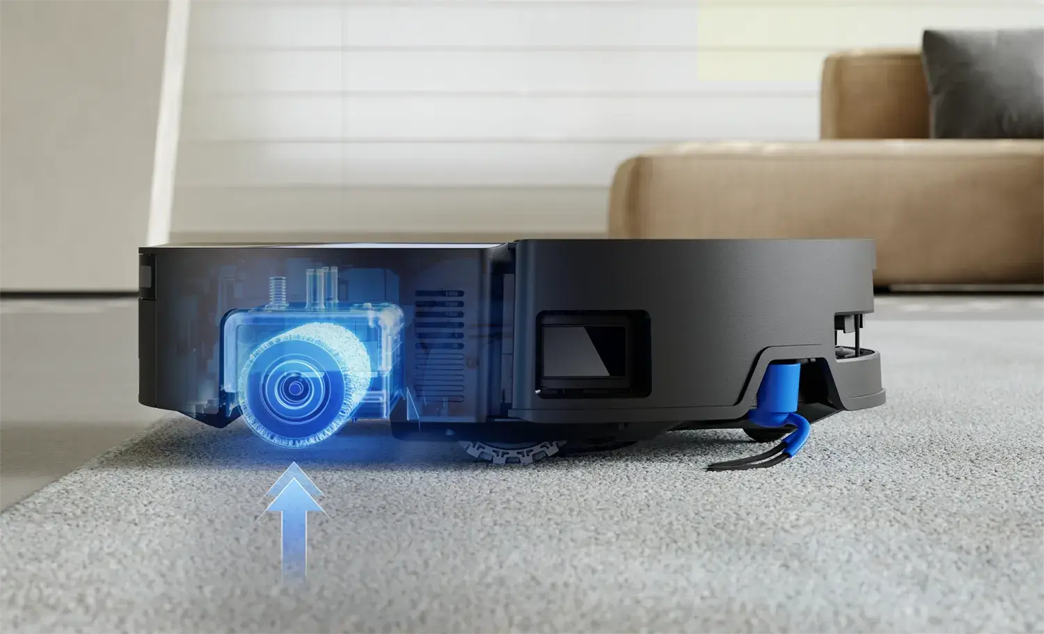Die Saugleistung liegt mit 18.000 Pa zwischen den beiden großen Brüdern und liegt weit über dem Standard der Preisklasse. Teppiche erkennt der Roboter automatisch und hebt den Mopp an, um sie trocken zu halten. Dazu kommen ZeroTangle 3.0 gegen Haarverwicklungen und eine KI-gestützte Navigation, die zielsicher Raum für Raum abarbeitet.